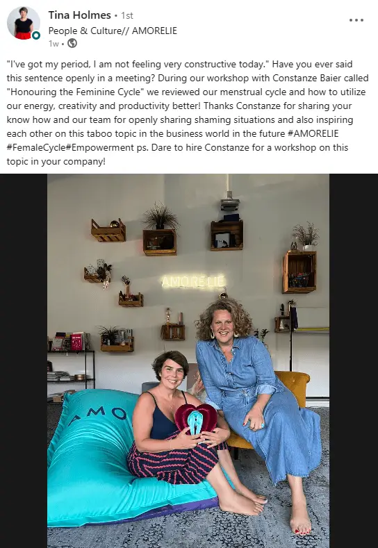 In meinen Workshops oder Vorträgen schaffe ich ein Bewusstsein, dass wir Frauen aufgrund unseres körperlichen Zyklus und der Menopause unterschiedliche Bedürfnisse im Arbeitsumfeld haben.